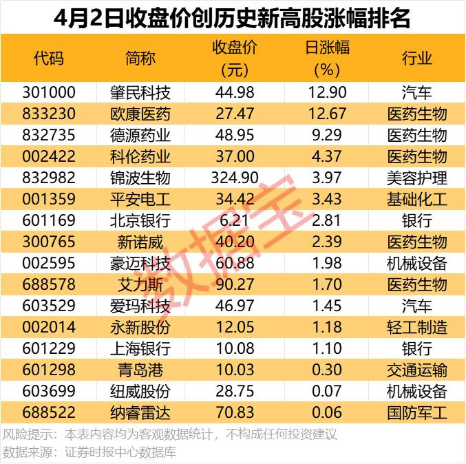 收盘价创历史新高股中,今日股价平均上涨3.73%,涨幅居前的有肇民科技、欧康医药、德源药业等。