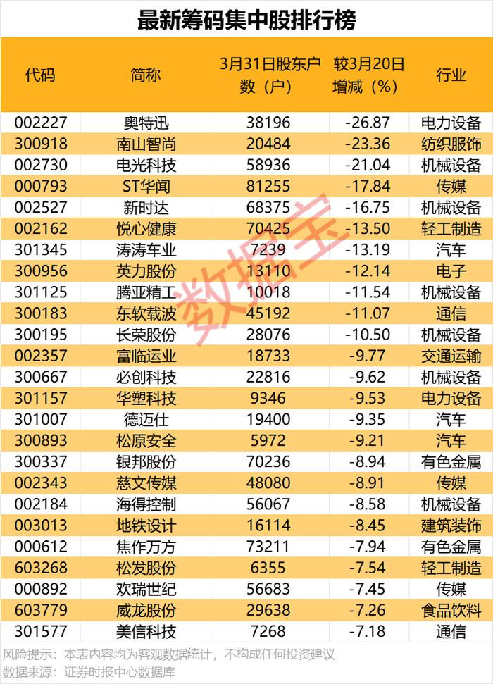 股东户数降幅最多的是奥特迅,截至3月31日最新股东户数为38196户,较3月20日下降26.87%;其次是南山智尚,截至3月31日最新股东户数为20484户,较3月20日下降23.36%。