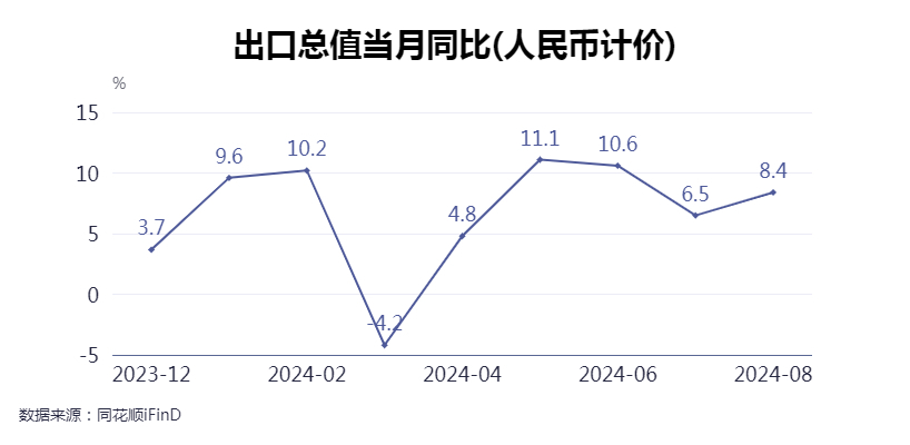 根据海关总署公布的数据,以人民币计价,中国8月出口同比增长8.4%,进口持平;贸易顺差6493.4亿元。