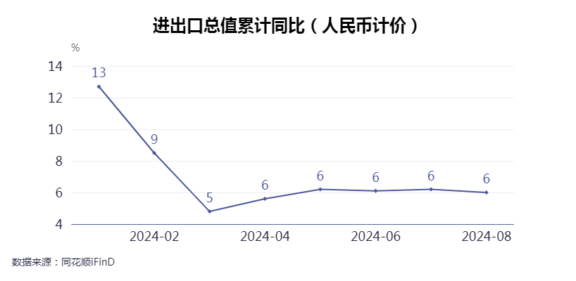 据海关统计,2024年前8个月,我国货物贸易进出口总值28.58万亿元人民币,同比增长6%。其中,出口16.45万亿元,增长6.9%;进口12.13万亿元,增长4.7%;贸易顺差4.32万亿元,扩大13.6%。