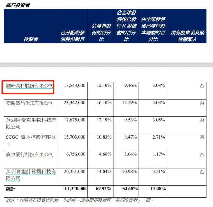 海螺材料科技此次IPO招股引入6名基石投资者,合共认购1.0137亿股(约人民币3.018亿元)的发售股份,其中A股新能源龙头国轩高科(002074.SZ)认购17543000股,基石投资者认购股份占全球发售股份的69.92%,占全球发售完成后总股份的17.48%。