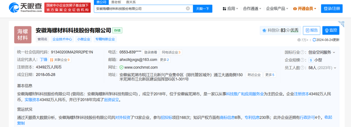 天眼查显示,海螺材料科技成立于2018年,位于安徽省芜湖市,是一家以从事科技推广和应用服务业为主的企业。企业注册资本43492万人民币,实缴资本43492万人民币,并已于2018年完成了出资设立。
