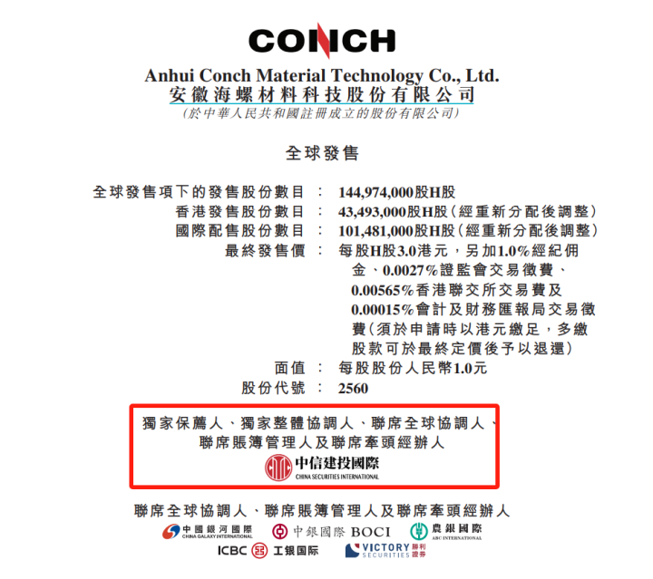 招股书显示,海螺材料科技此次IPO全球发售1.44974亿股H股,占发行完成后总股份的25%,每股发售价下限定价3.00港元,募集资金总额约4.35亿港元,所得款净额约3.96亿港元。海螺材料科技是次招股公开发售部分获25.83倍认购,国际发售部分获1.04倍认购。中信建投国际为其独家保荐人、独家整体协调人、联席全球协调人、联席账簿管理人、联席牵头经办人。